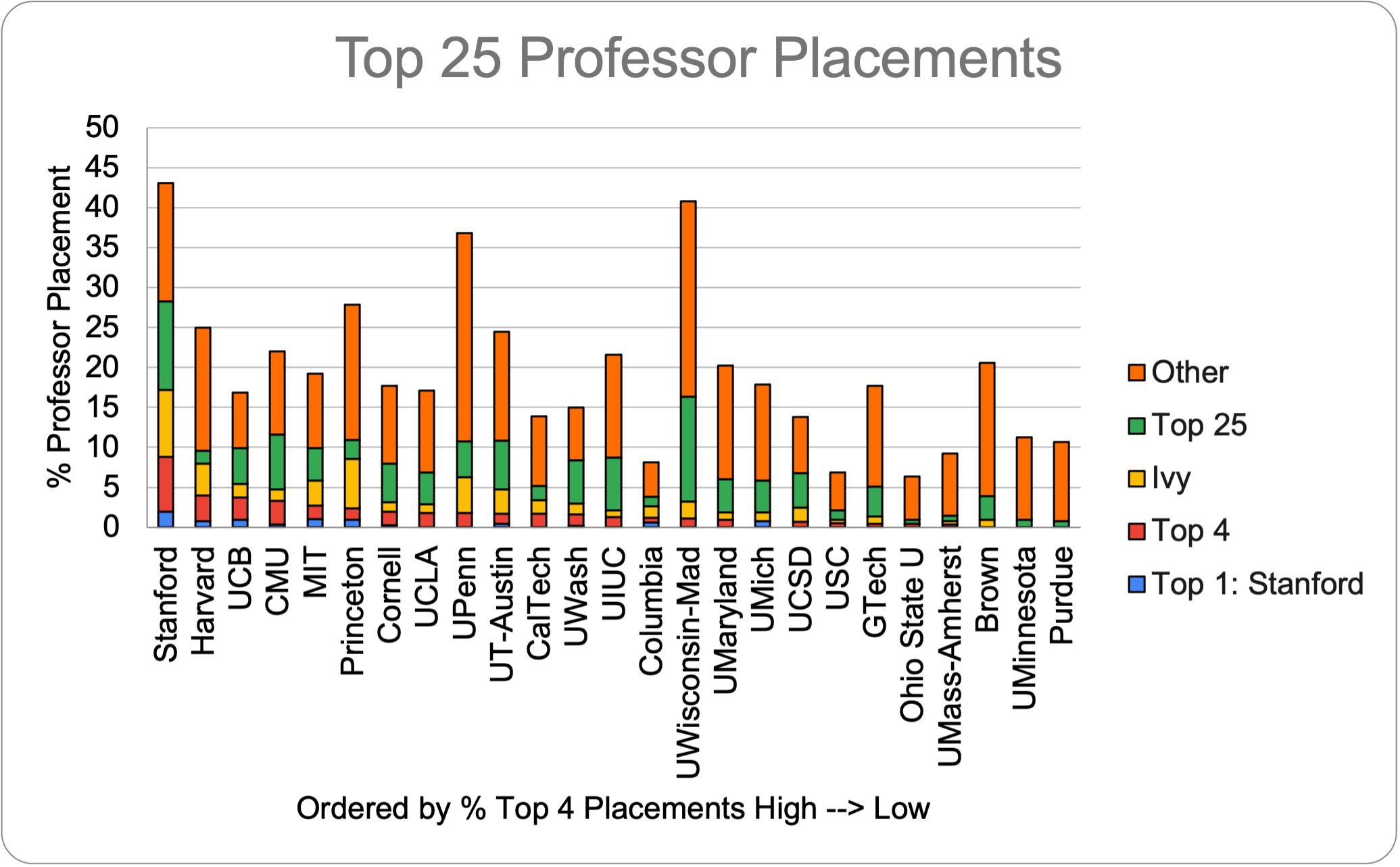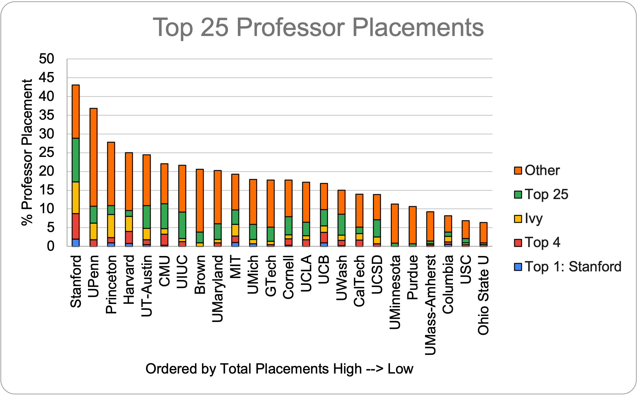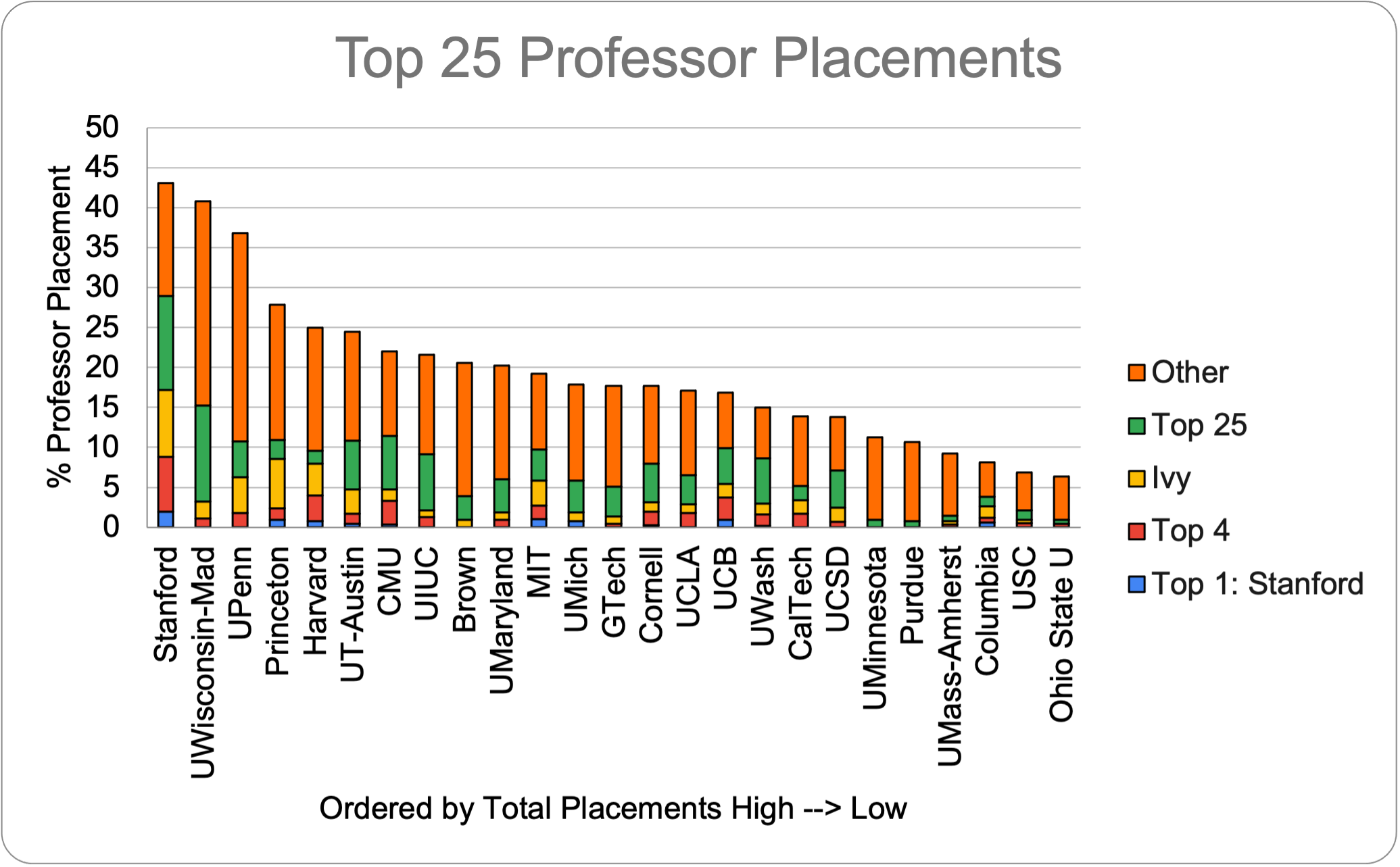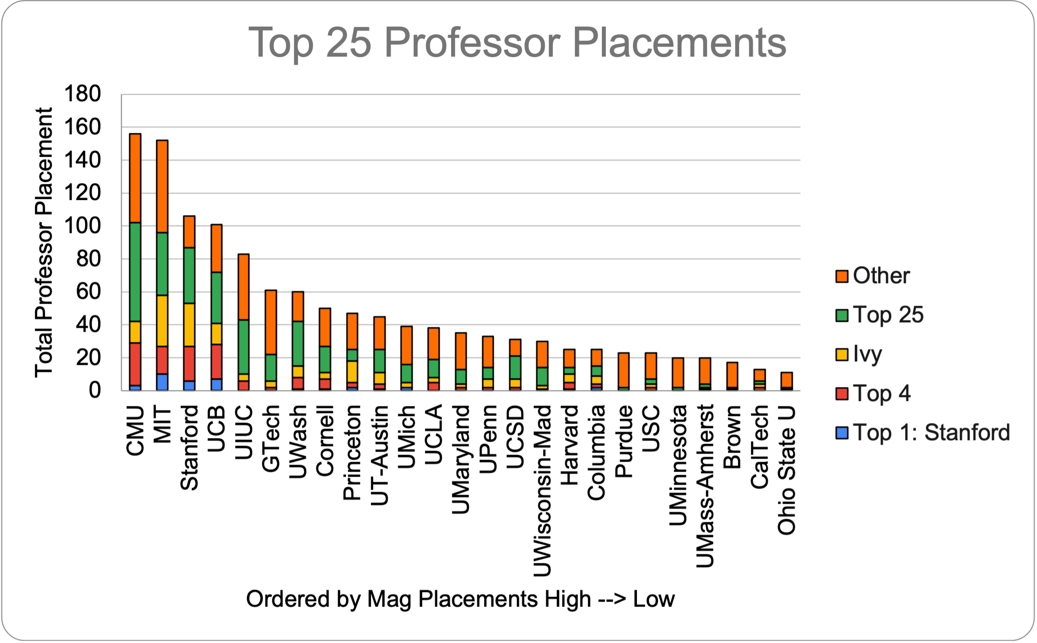This info was manually gathered from various sources including source degrees conferred statistics from individual universities, Jeff Huang, CSrankings, and USNews. We analyzed the 25 universities with the top total professor placements according to Jeff Huang.
